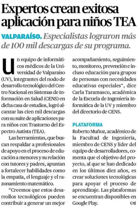 Un equipo de informáticos médicos de la Universidad de Valparaíso (UV), integrantes del nodo de desarrollo tecnológico del Centro Nacional en Sistemas de Información en Salud (CENS) en dicha casa de estudios, logró alcanzar las cien mil descargas con su suite de aplicaciones para niños con Trastorno del Espectro Autista (TEA).